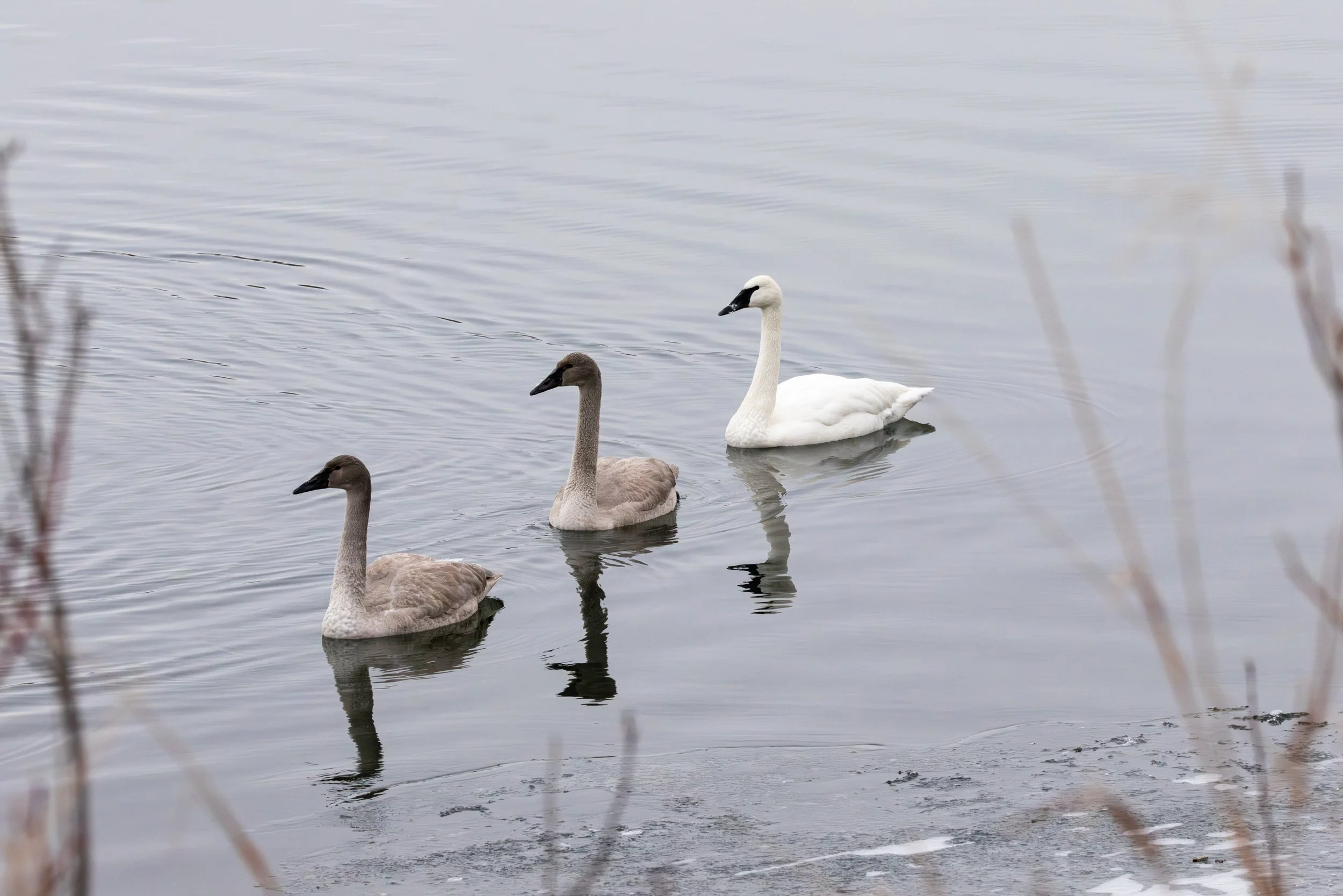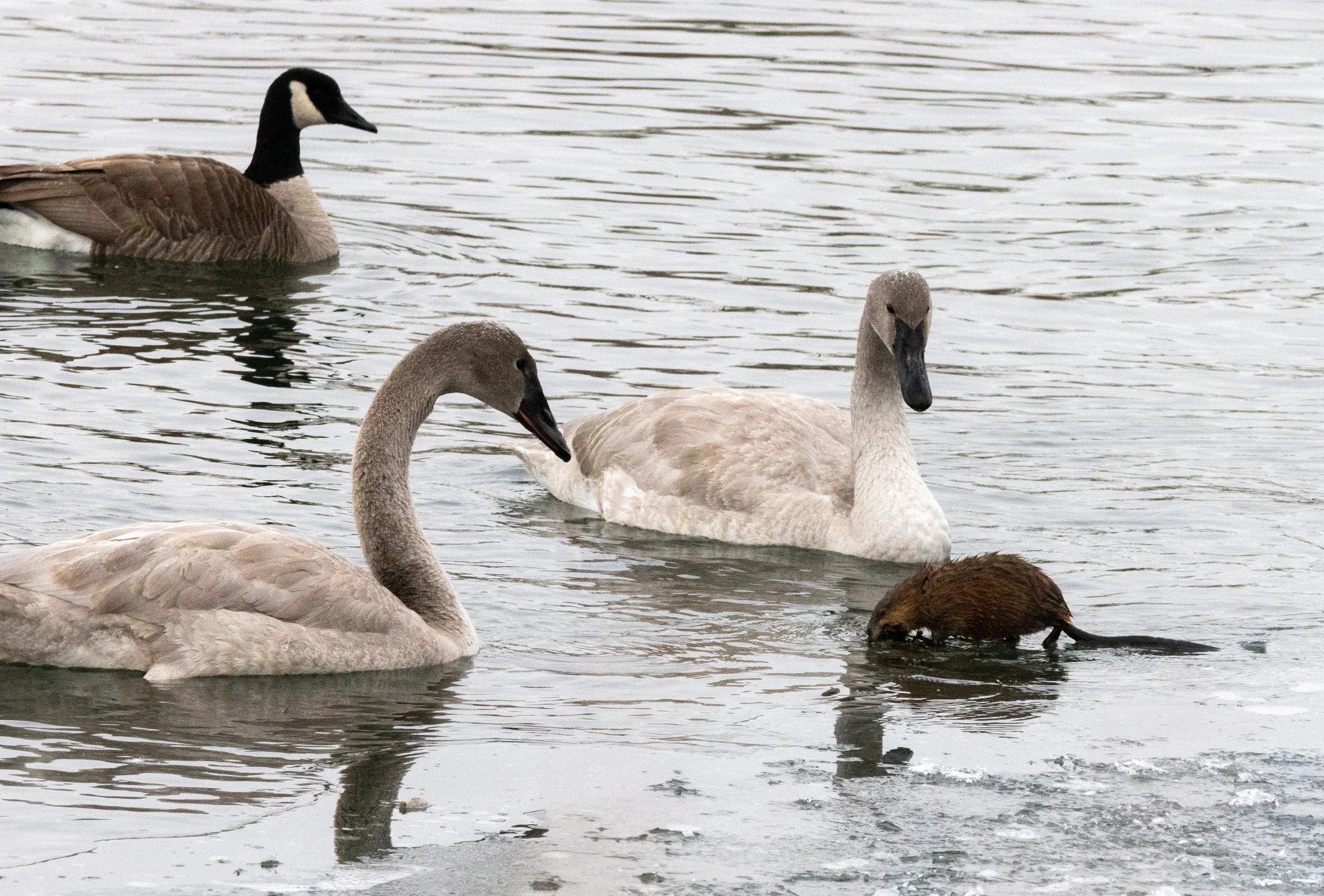 I stayed there watching the those beautiful swans, snapping as many photos as I could. They must have spotted the muskrat on the ice because a couple of them made their way over to it. They surrounded that little guy and he must have been kicked out of that spot because it jumped in the water and swam off.