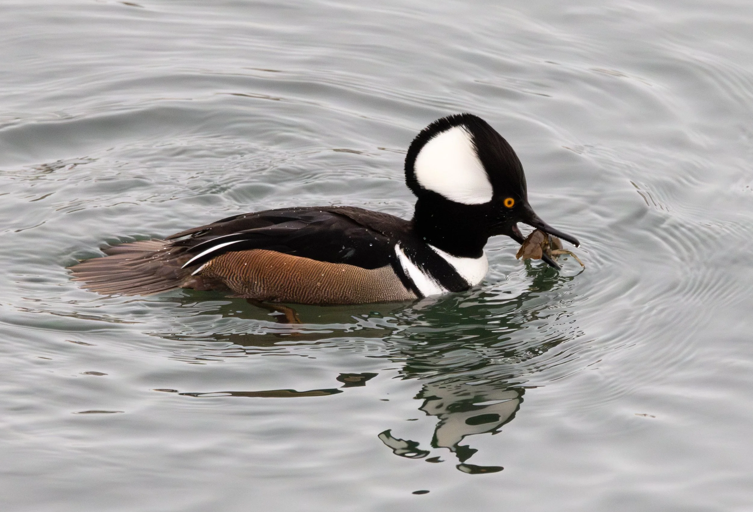 After enjoying that bit of drama out on the water, I continued my way along the path. I met up with a different photographer who frequents the parks and he mentioned that Harlequin duck hasn’t been seen for a few days. It must have taken off to a different part of the river or maybe even left Calgary. You never know what they do. One thing I did see was a Hooded Merganser along the bank hunting for crayfish. I got to see it catch a large crayfish and shake it around to try to eat it. I am thinking it may have been too large for it as it disappeared from its beak when it swam its way further along the bank.