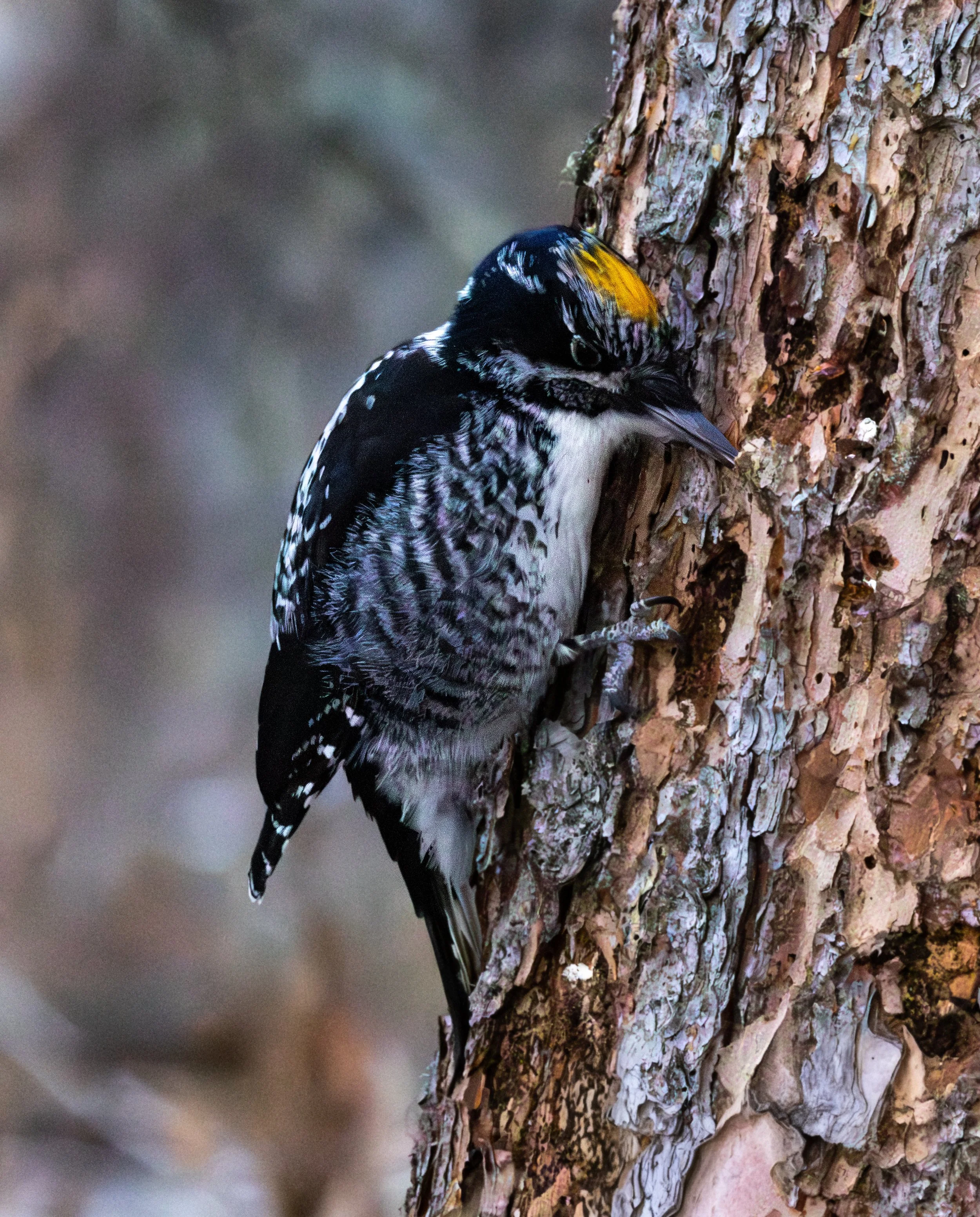I saw lots more of the Three-Toed Woodpecker where I was able to capture quite a few nice photos. I got two which I really liked: One had the woodpecker backlit to the rising sun where you got a silhouette as well as seeing some of the dust and debris it kicked up while pecking. The other photo was one that I was able to get closer to and you could see its little tongue going into the hole it made searching for any bugs to munch on.