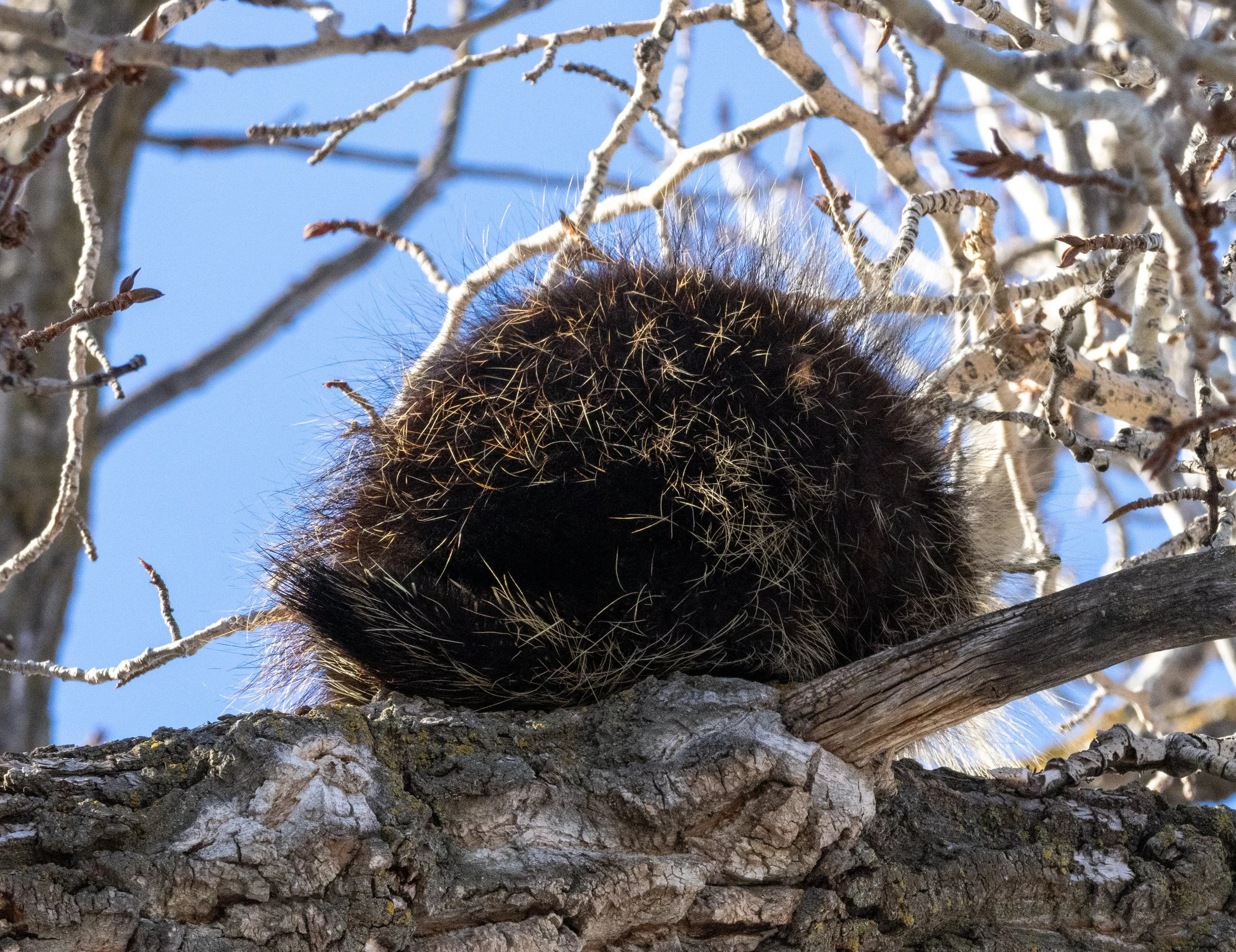 The other critter I saw was not a bird at all, but a porcupine. I was scanning the trees on my way back and noticed a black ball up on a tree branch. I looked in my camera and it was not just a black ball, but a black ball of fur of a porcupine. I shocked myself when I saw it as it is very inconspicuous and hard to spot unless you're at a certain angle. Which explains why I didn't see it when I first passed it. I wandered into the bush to see if I could get a better angle as all I had gotten was its tail, but it was so neatly tucked in that it was hiding its cute little face anyway. I even let some others know about it who were walking past who were amazed at how camouflaged it was. They would never have seen it without me pointing it out.