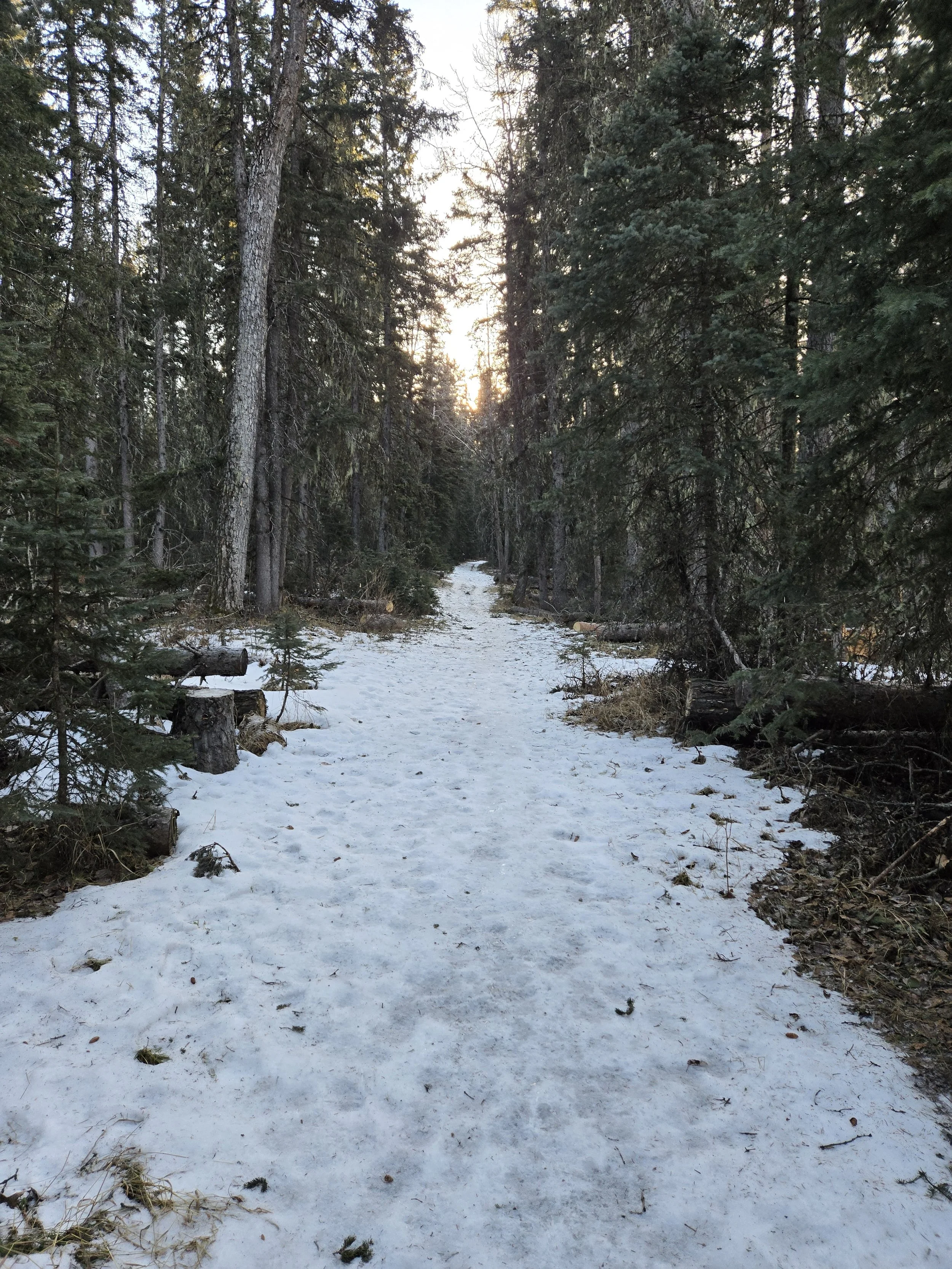After I basked in the beautiful sight of those morning mountains, I started my descent I heard some more chickadees which stuck around longer than the previous ones, so I checked my Merlin app to see which kind. In Alberta, the three most common chickadees found are Black-Capped (being the most common), Mountain, and Boreal. The app told me that these were boreal chickadees which I confirmed when one landed nearby. These ones will have some brown on their body whereas the others are typically just black and white. This was one of the three I did not have a photo of so I was stoked to have a chance of getting one. Unfortunately, all I as able to get were the classic bird butt photos, so I will have to try again another time.