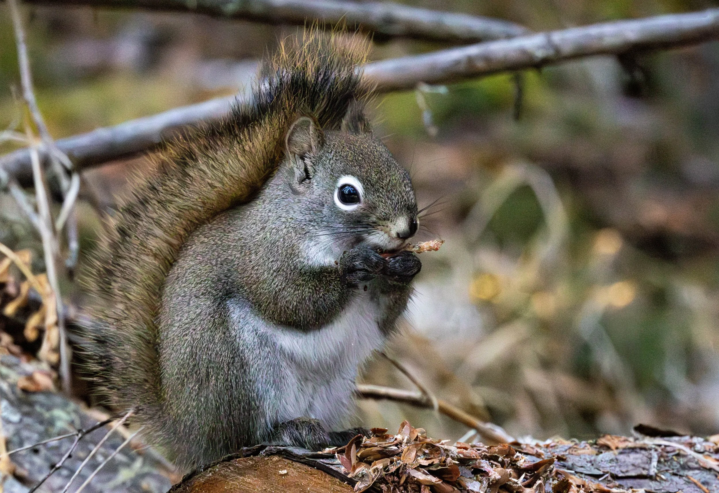 While on that route I saw numerous red squirrels and gray squirrels. Most of them chattered at me from branches above or scurried away as I walked along the trail. They tended to be quite camera shy today, except for one who somehow didn't notice me. It must have been more concerned with the little bit of food it found. I got eye level with it and started snapping some fairly close up photos. I crept closer and closer trying to decrease my zoom until it finally spotted me and it took off to eat its morning snack elsewhere. I didn't see much for most of my ascent to the top outside of some chickadees which flew about too quickly and disappeared into the forest.